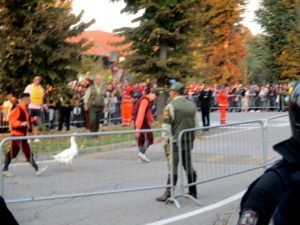 La “festa” è stata triste e deprimente; la sfilata dei carri misera e priva di significato. Le Oche sono arrivate davanti alla postazione del presidio stanche, rifiutavano di proseguire, tanto che i conduttori le afferravano per le ali e le prendevano a calci.
