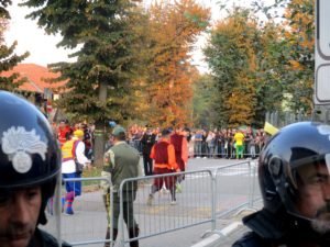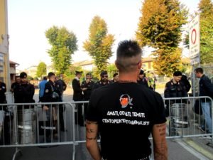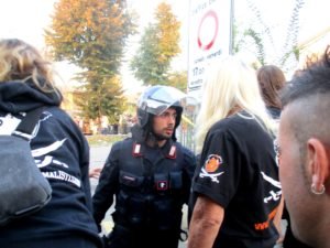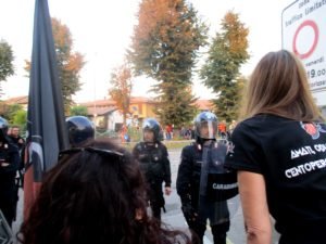 Il presidio era controllato da un notevole schieramento di Carabinieri; dell’altra parte un gruppetto di giovani idioti cenciosi locali (età media 13 anni) che cercavano di provocare. A un certo punto hanno lanciato dei sassi, uno dei quali ha colpito a un piede un Carabiniere. L’efficacia del presidio si può misurare dalle reazioni isteriche sul web di qualche supporter locale e di una presuntuosa  pseudo federazione che nelle aule dei tribunali, contro i Militanti di Centopercentoanimalisti, ha collezionato una serie di sconfitte e risarcimenti economici memorabili.