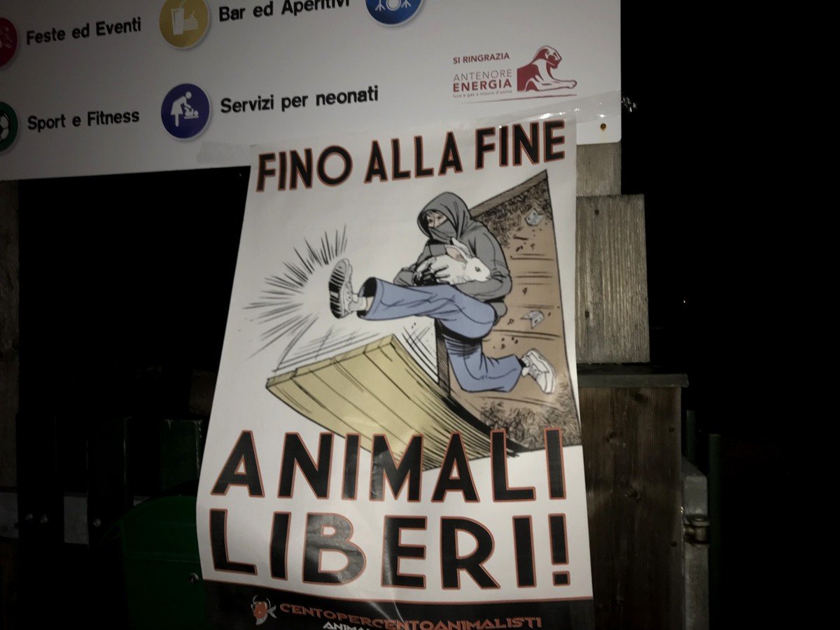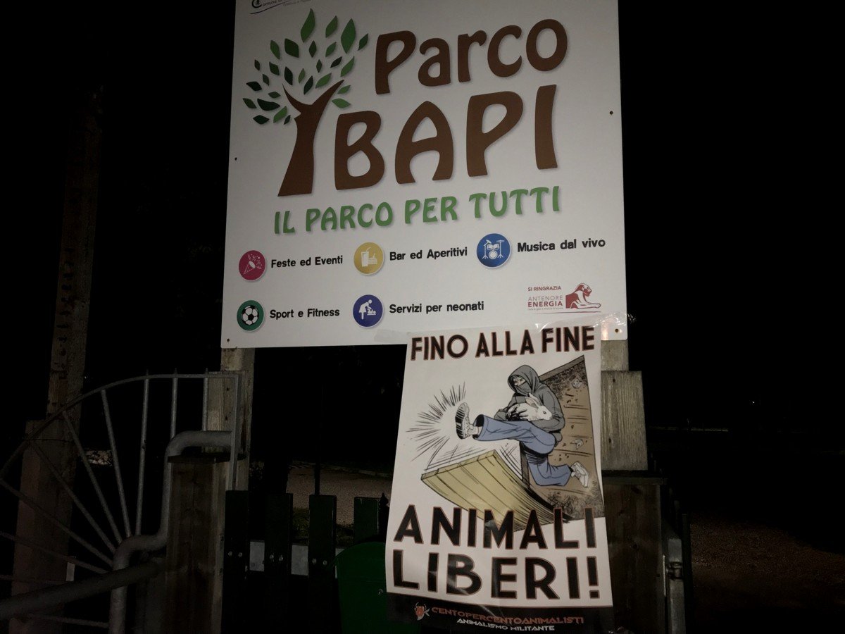Per far capire ai diretti interessati il nostro pensiero, Militanti di CENTOPERCENTOANIMALISTI nella notte tra il 29 e 30 maggio, hanno affisso sui cancelli del parco Bapi a Mestrino e all’ingresso dello sponsor Antenore Energia a Sarmeola, manifesti che non ammettono equivoci sui Conigli. Non sono escluse in futuro, altre azioni di protesta nei confronti dei gestori del parco Bapi che, oltre ad aver concesso lo spazio, hanno pubblicato alcune foto (salvate e pubblicate sotto) che hanno indignato non solo gli Animalisti.