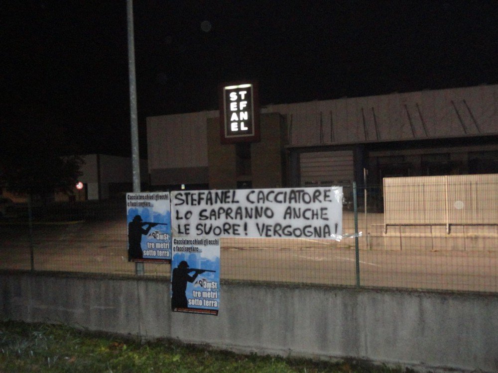 Nella notte tra il 14 e 15 gennaio, militanti di Centopercentoanimalisti hanno affisso sulla rete della sede dell’azienda in via Postumia, 85 a Ponte di Piave (Treviso), manifesti ironici contro la caccia e uno striscione gigante diretto a Stefanel, non tutti sanno che barbara attività  pratica questo noto imprenditore, ci penseremo noi a farlo sapere a tutti gli Italiani, suore comprese.