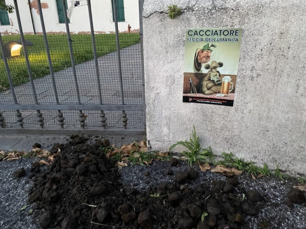 Nel tardo pomeriggio di martedì 25 maggio, Militanti di CENTOPERCENTOANIMALISTI si sono recati presso la sede dell’ente Parco dei colli Euganei a Este (Padova) ed hanno versato 10 Kg di sterco Equino davanti all’entrata, inoltre hanno affisso manifestini contro i cacciatori e uno di “monito”. La nostra lotta è ufficialmente iniziata.