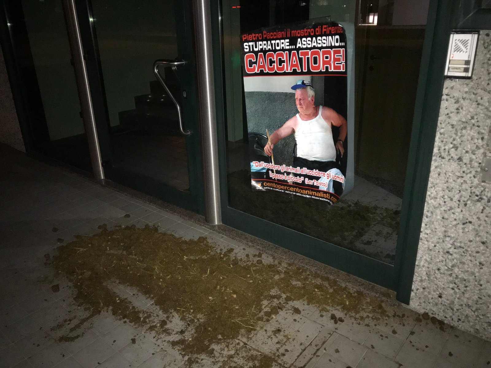 Per mostrare quanto consideriamo le sue denunce, nella notte tra il 23 e 24 ottobre, militanti di CENTOPERCENTOANIMALISTI hanno affisso uno striscione con l’icona dei cacciatori Pietro Pacciani e versato davanti all’ingresso di confavi a Thiene, una notevole quantità di sterco e letame.