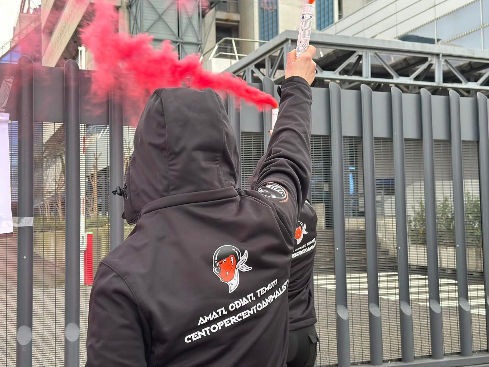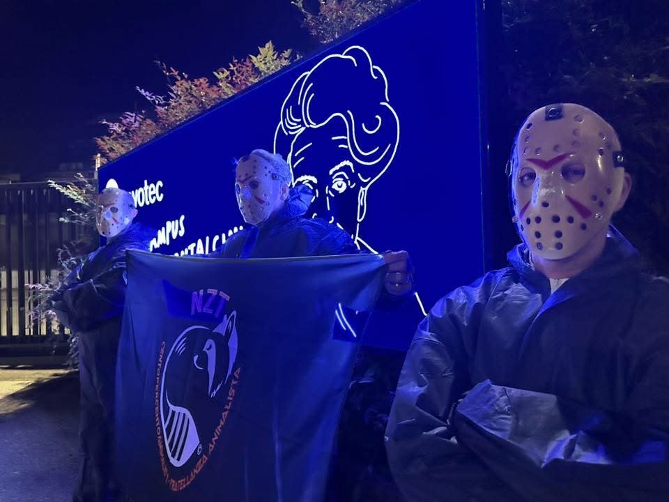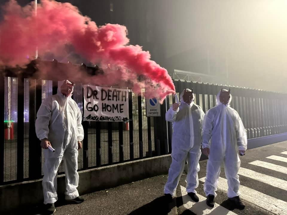 In tarda serata di lunedì 4 novembre, Militanti del Movimento CENTOPERCENTOANIMALISTI, hanno indossato tute da laboratorio, maschere da diavoli, e si sono posizionati davanti ai cancelli di Aptuit in via Fleming a Verona, affiggendo