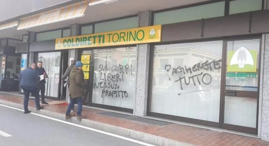 9 marzo 2023 – Caluso (Torino), ALF imbrattano la sede della Codiretti: pagherete tutto. L’azione porta la firma dell’organizzazione estremista attiva in 40 Paesi. Vernice rossa all’ingresso. Sulle vetrine le scritte: «Nessun profitto sui