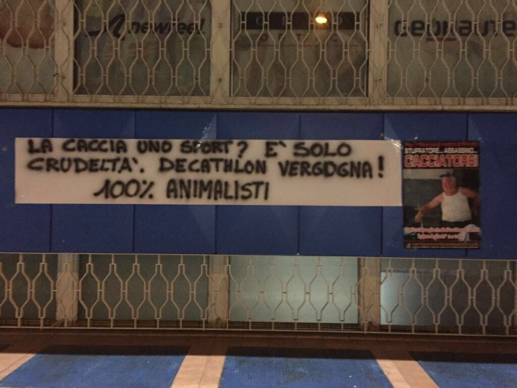 Dopo i primi due blitz ai punti vendita di Decathlon, contro l’apertura di una linea di vendita di accessori per i cacciatori, militanti di CENTOPERCENTOANIMALISTI hanno ripetuto l’azione di denuncia ai punti vendita di