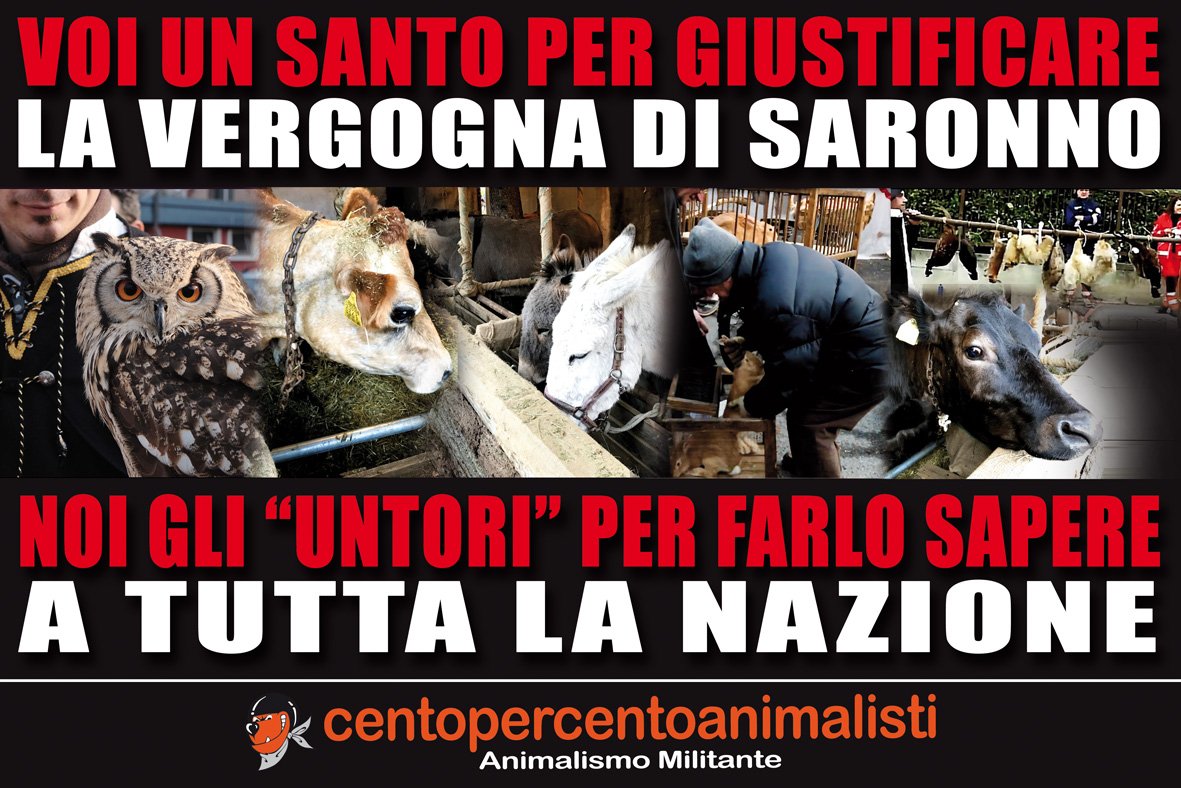 Apprendiamo con “terrore” che un militante di CENTOPERCENTOANIMALISTI è stato identificato come responsabile di aver affisso manifesti contro la vergognosa sagra di Saronno, nella quale molti Animali vengono sottoposti al maltrattamento in onore del