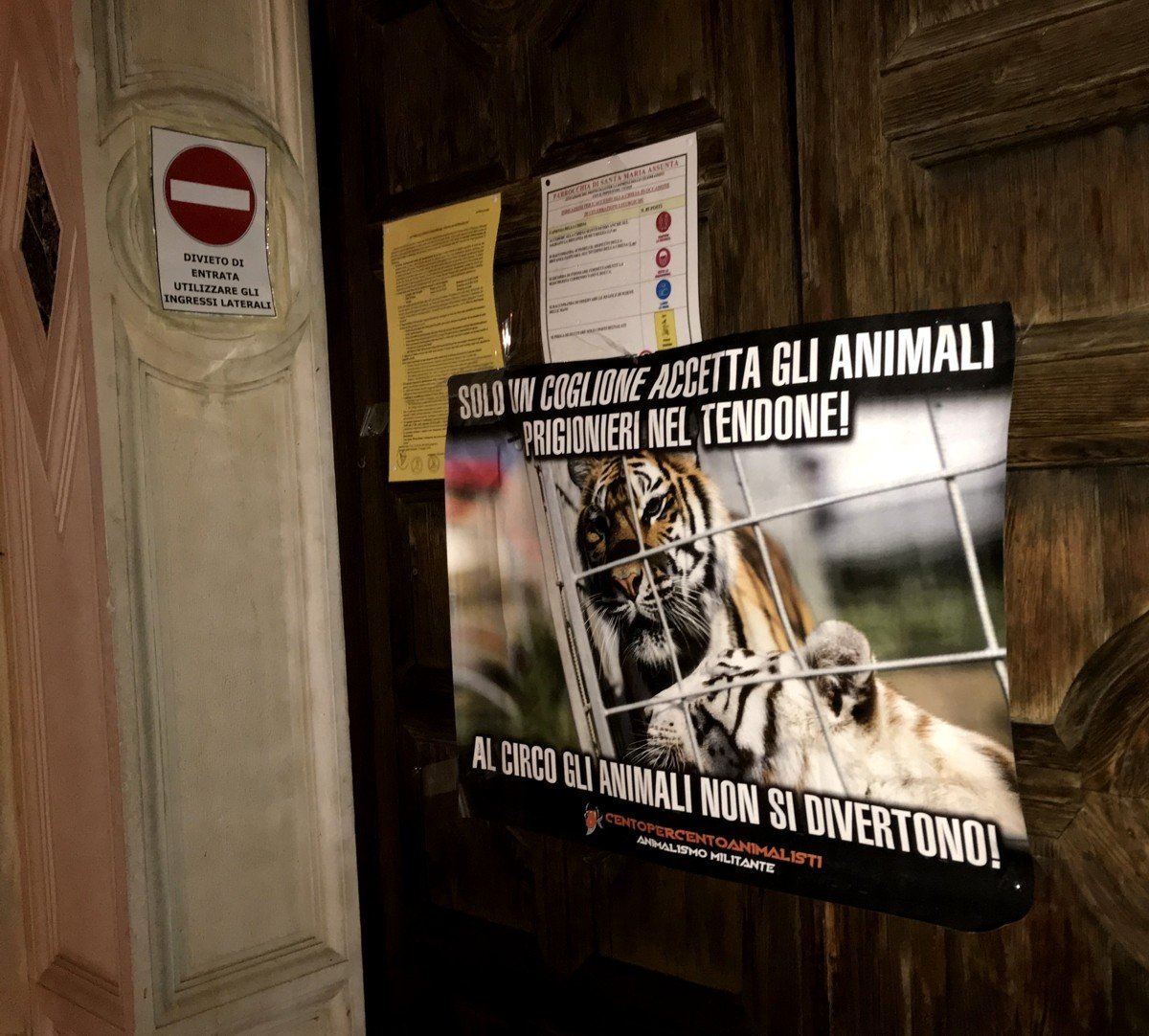 Il prete sostiene che gli Animali nei circhi stanno bene: o manca completamente di capacità di giudizio, o si è dimenticato dell’VIII comandamento. Nostri militanti, nella notte tra martedì 9 giugno e mercoledì 10 giugno, hanno affisso sul portone della chiesa “arcipretale” in piazza dei Martiri a Sernaglia della Battaglia (Treviso), un manifesto che non ammette equivoci…