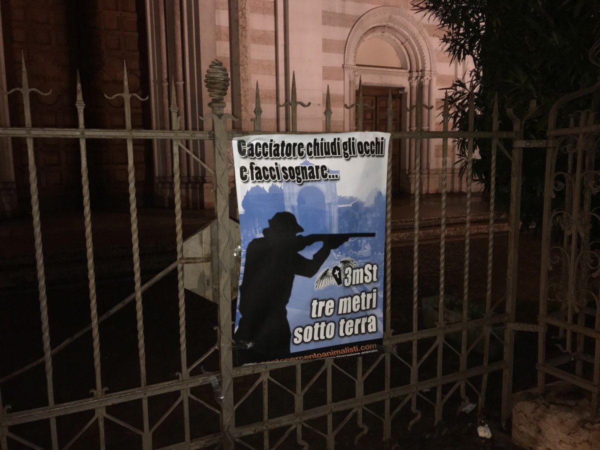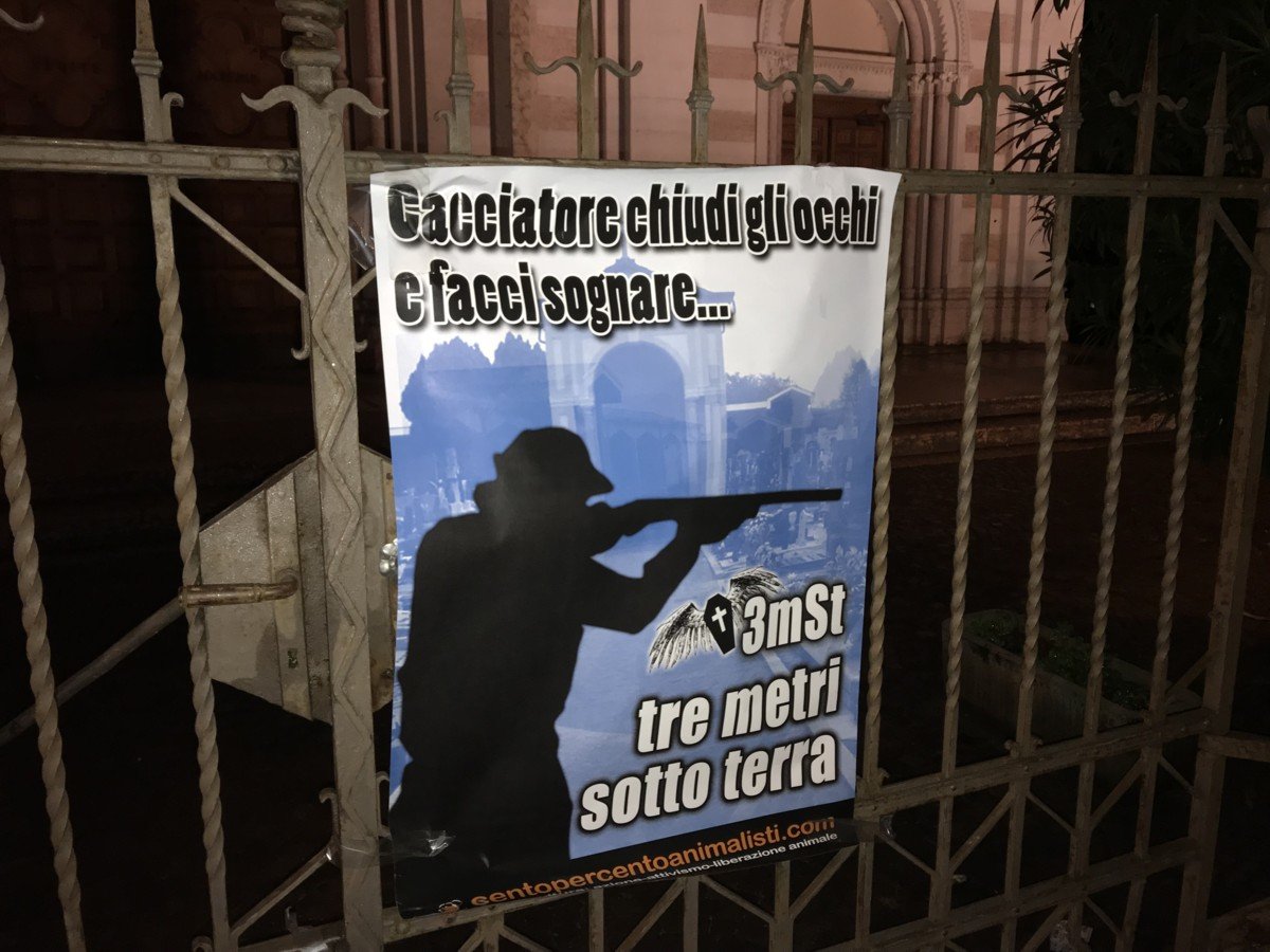 Per far capire al prete venduto che a CENTOPERCENTOANIMALISTI nulla sfugge, a titolo simbolico, nella notte tra il 5 e 6 novembre, è stato affisso un manifesto di buon auspicio ironico contro i cacciatori, sul cancello della chiesa. Ricordiamo al prete che l’unica messa buona per i cacciatori è quella funebre!