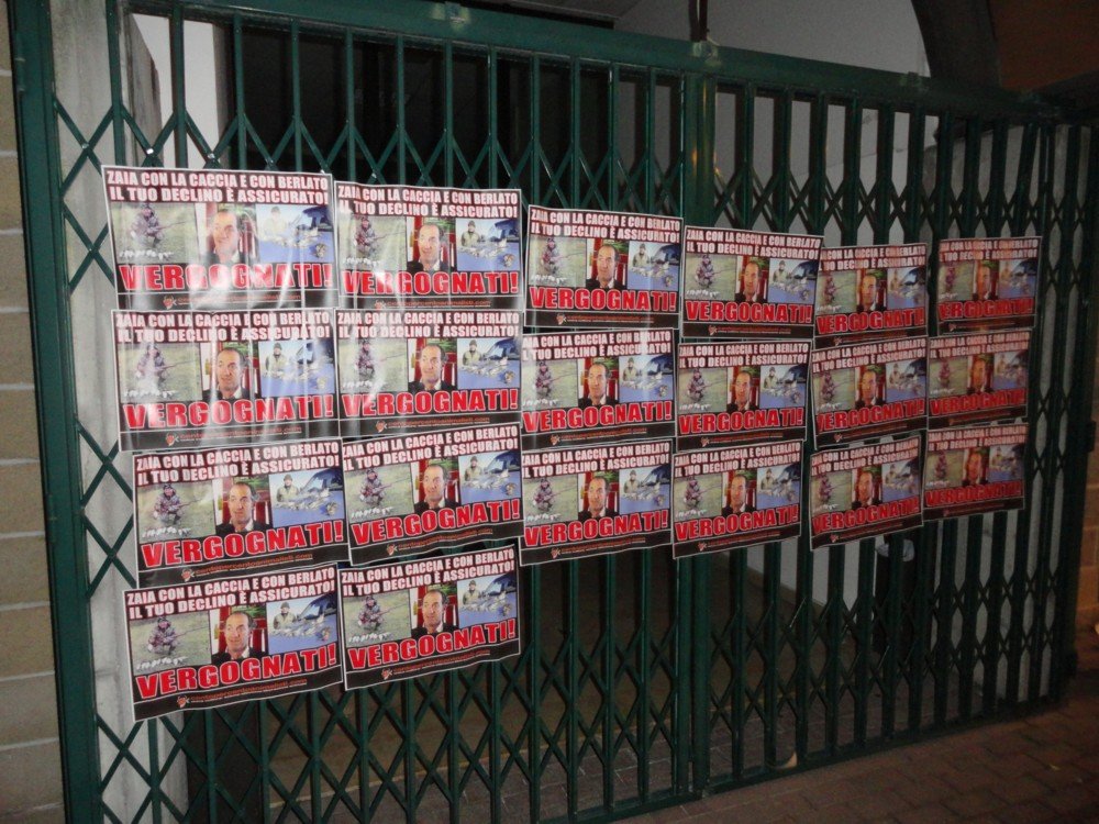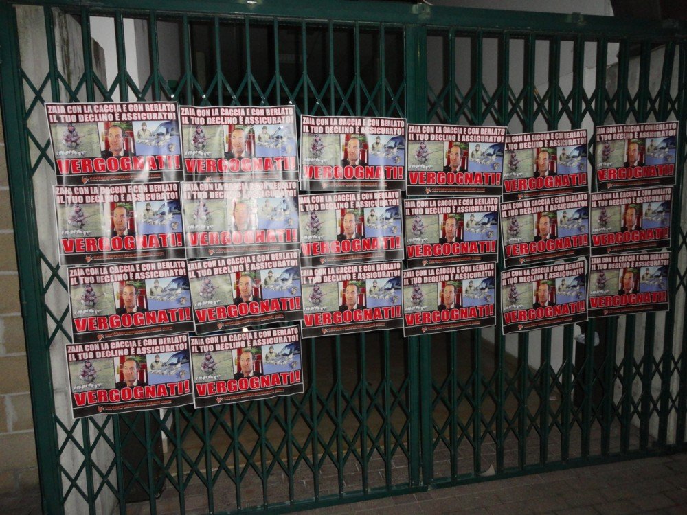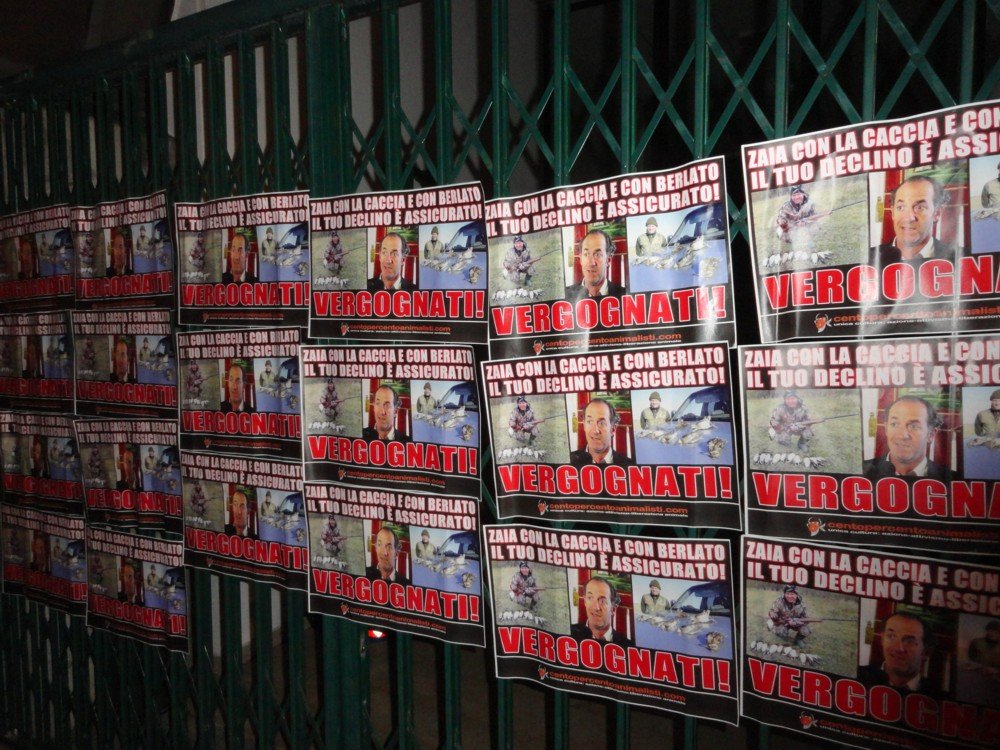 Nella notte tra il 4 e 5 marzo, militanti di Centopercentoanimalisti hanno tappezzato la sede della Lega Nord di Treviso in via Fontane a Villorba, con locandine adesive che ritraggono Zaia e il trombato butterato di Santorso mentre ostenta soddisfazione e orgoglio facendosi immortalare con i poveri Animali indifesi che hanno avuto la sfortuna di incontrare lui e il suo fucile.