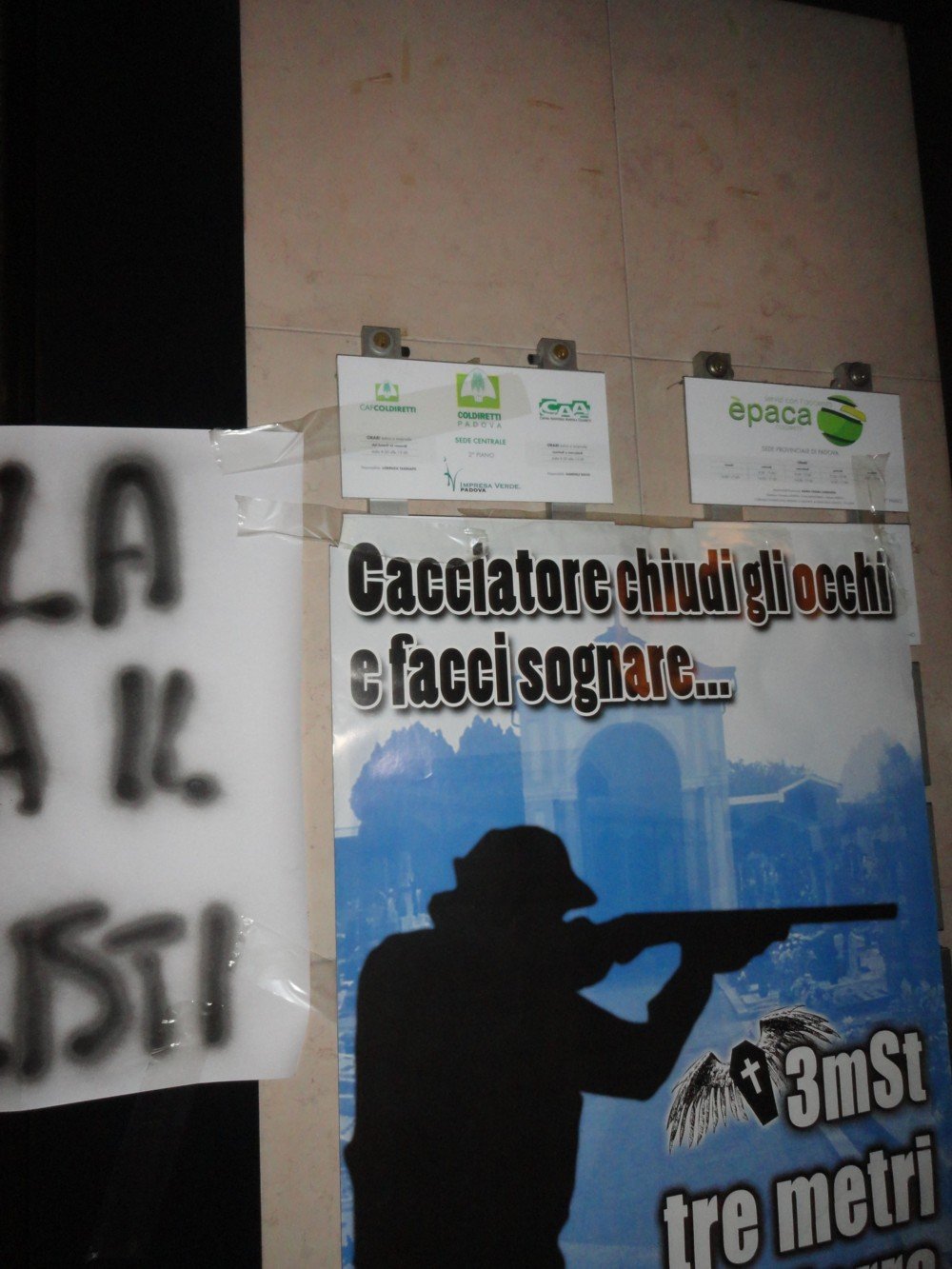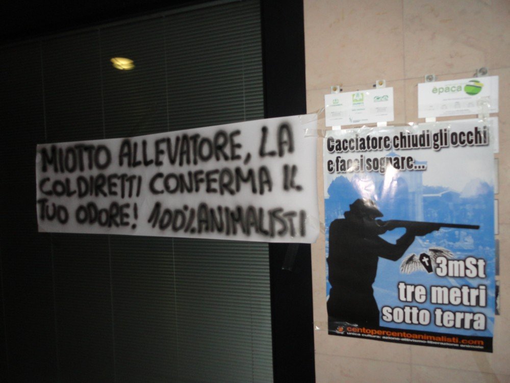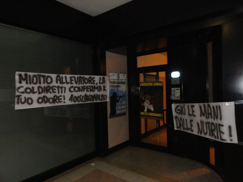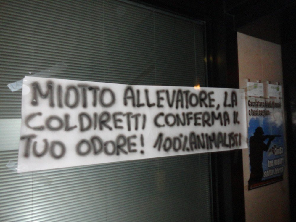 Nella notte tra il 9 e 10 marzo, militanti di Centopercentoanimalisti hanno affisso per protesta manifesti di liberazione Animale, manifesti contro la caccia e due striscioni diretti a Miotto sull’entrata della sede Padovana di Coldiretti in via Croce Rossa.