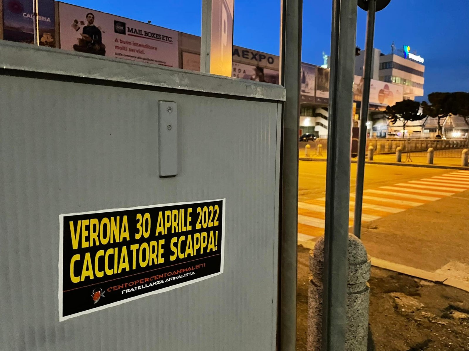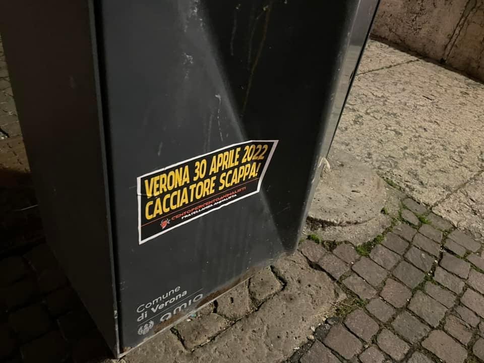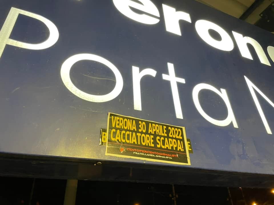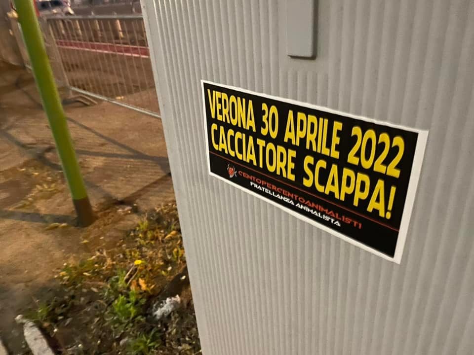 Militanti di CENTOPERCENTOANIMALISTI, nella serata del 7 aprile, hanno tappezzato numerosi punti nevralgici di Verona (stazione Porta Nuova, Municipio, Arena, zona Fiera…) con adesivi eloquenti: “VERONA, 30 APRILE 2022, CACCIATORE SCAPPA!”