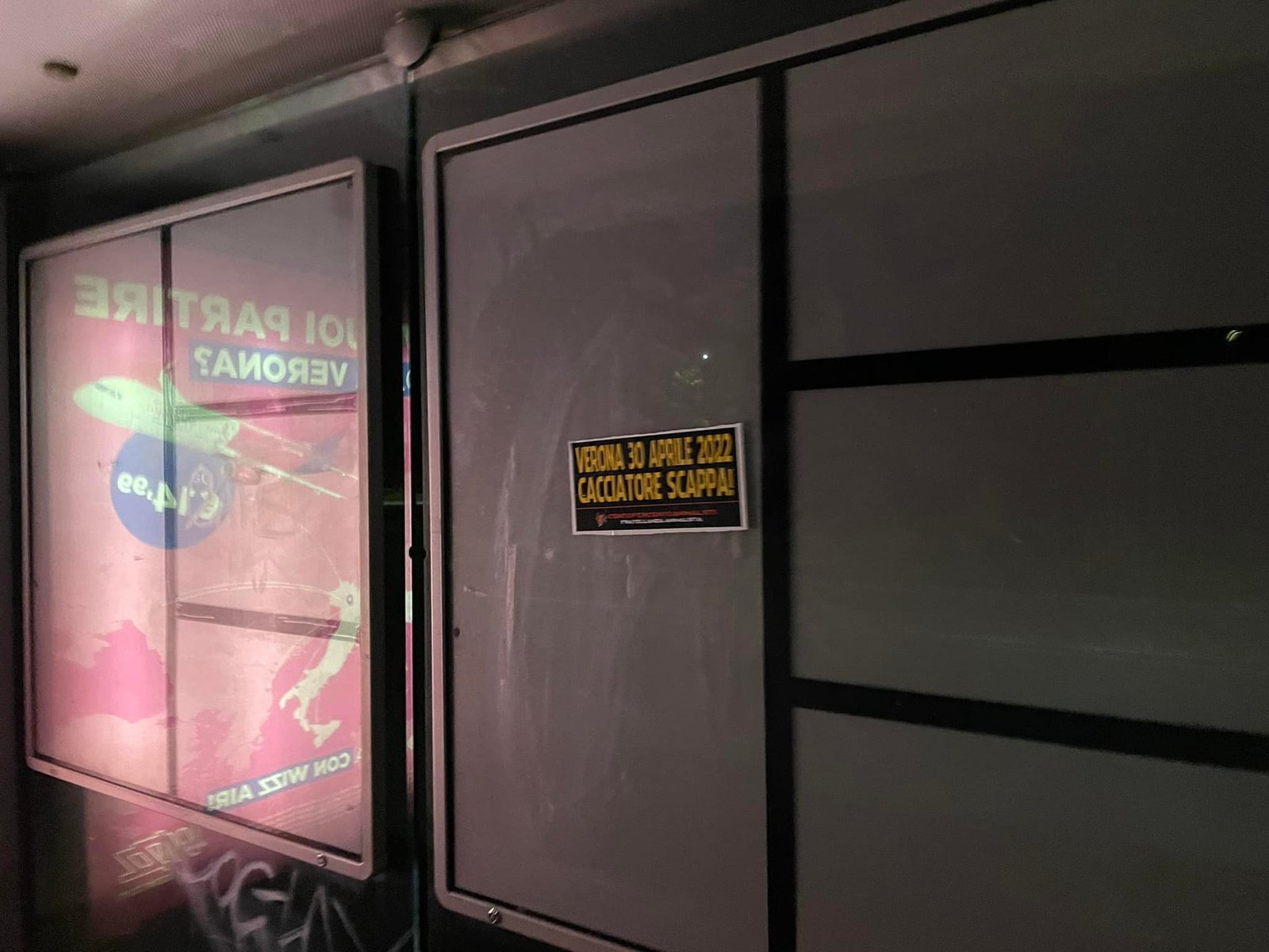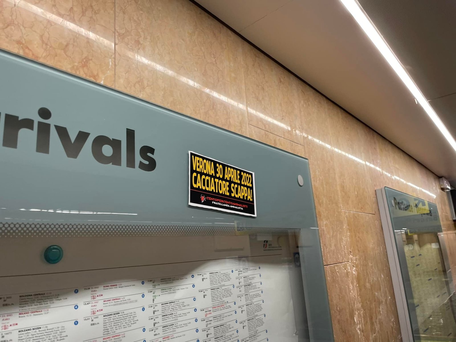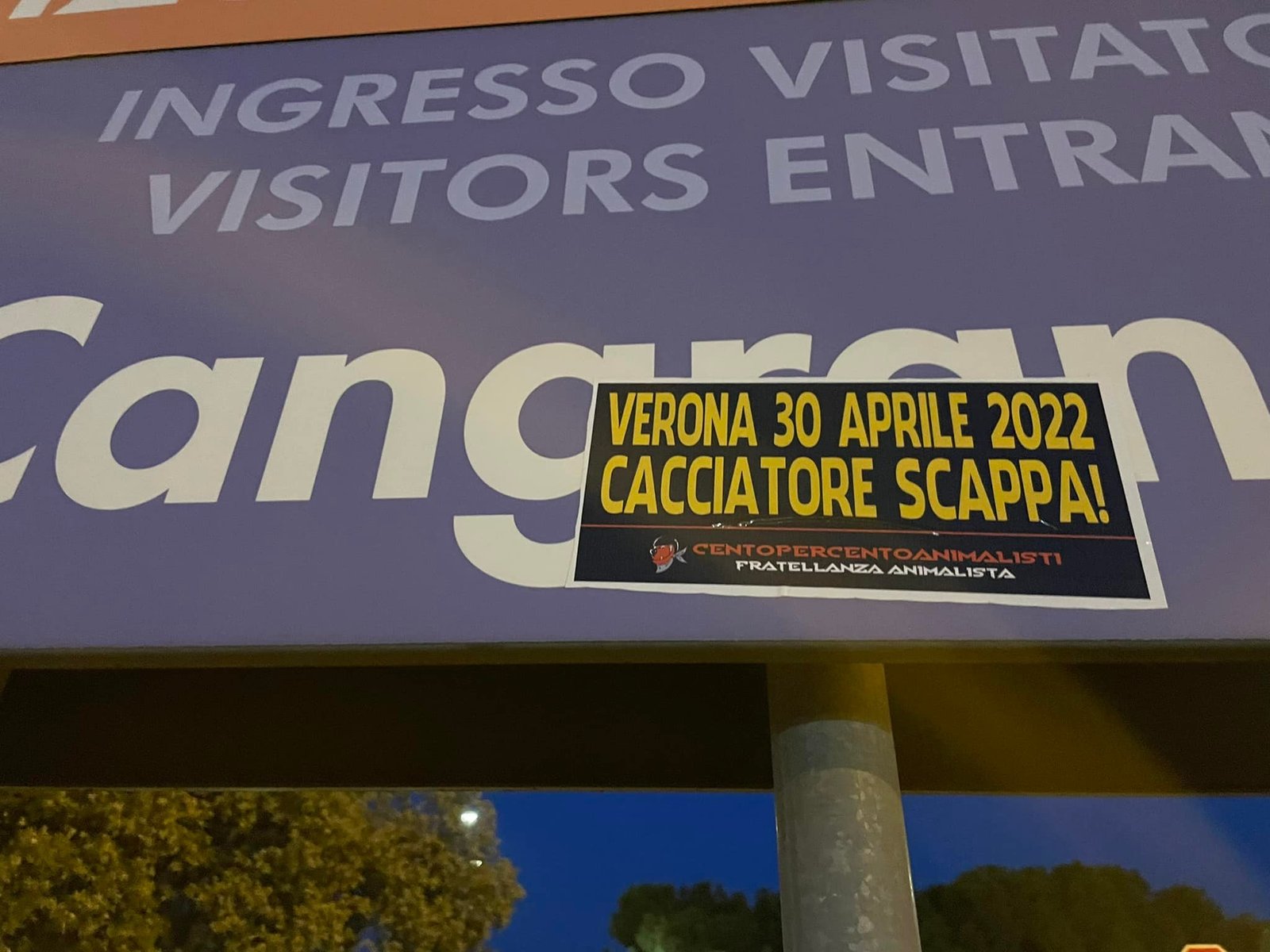 Militanti di CENTOPERCENTOANIMALISTI, nella serata del 7 aprile, hanno tappezzato numerosi punti nevralgici di Verona (stazione Porta Nuova, Municipio, Arena, zona Fiera…) con adesivi eloquenti: “VERONA, 30 APRILE 2022, CACCIATORE SCAPPA!”
