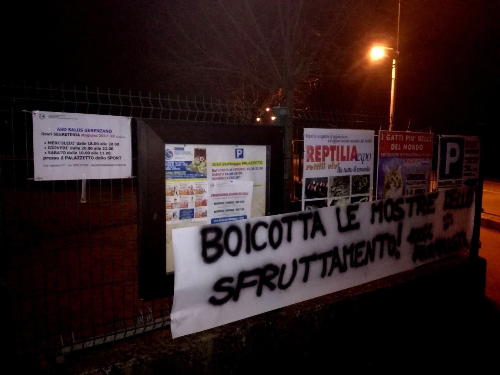 Militanti di CENTOPERCENTOANIMALISTI, nella notte tra il 30 e 31 marzo, hanno affisso uno striscione di protesta sui cancelli del palazzetto dello sport di Gerenzano in via Inglesina, luogo dove si svolgerà la manifestazione.