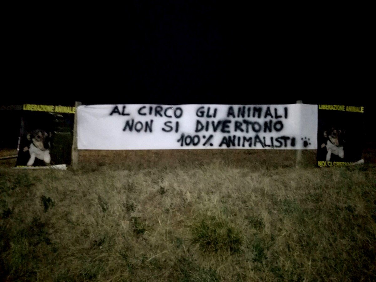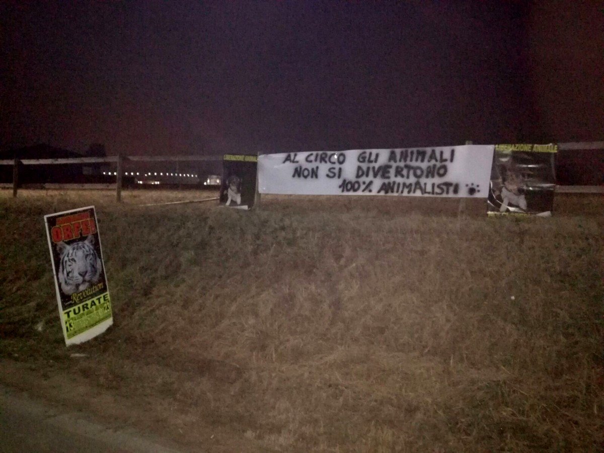 Nella notte tra il 9 e 10 gennaio, militanti di CENTOPERCENTOANIMALISTI hanno affisso manifesti di Liberazione Animale e uno striscione cristallino nell’area dove si attenderà il circo di Armando Orfei in via Garibaldi a Turate, al circo gli Animali non si divertono