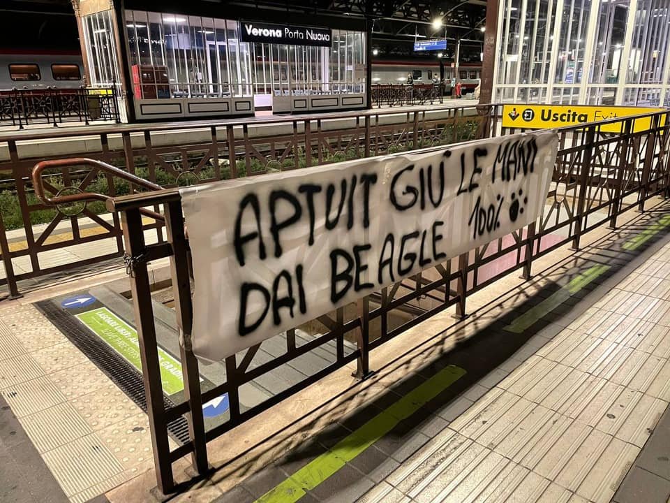 In vista dell’organizzazione di una manifestazione a Verona prevista domenica 26 settembre davanti all’Aptuit, dove sono detenuti, oltre ad altri Animali, 20 cuccioli di Beagle di appena quattro mesi destinati agli esperimenti più infami, militanti di CENTOPERCENTOANIMALISTI nella serata di lunedì 13 settembre, hanno tappezzato alcuni punti nevralgici della città con striscioni che chiedono la loro liberazione. Gli striscioni sono stati afflissi all’Arena, al Municipio, alle stazioni dei treni di Verona porta nova e Verona porta Vescovo.
