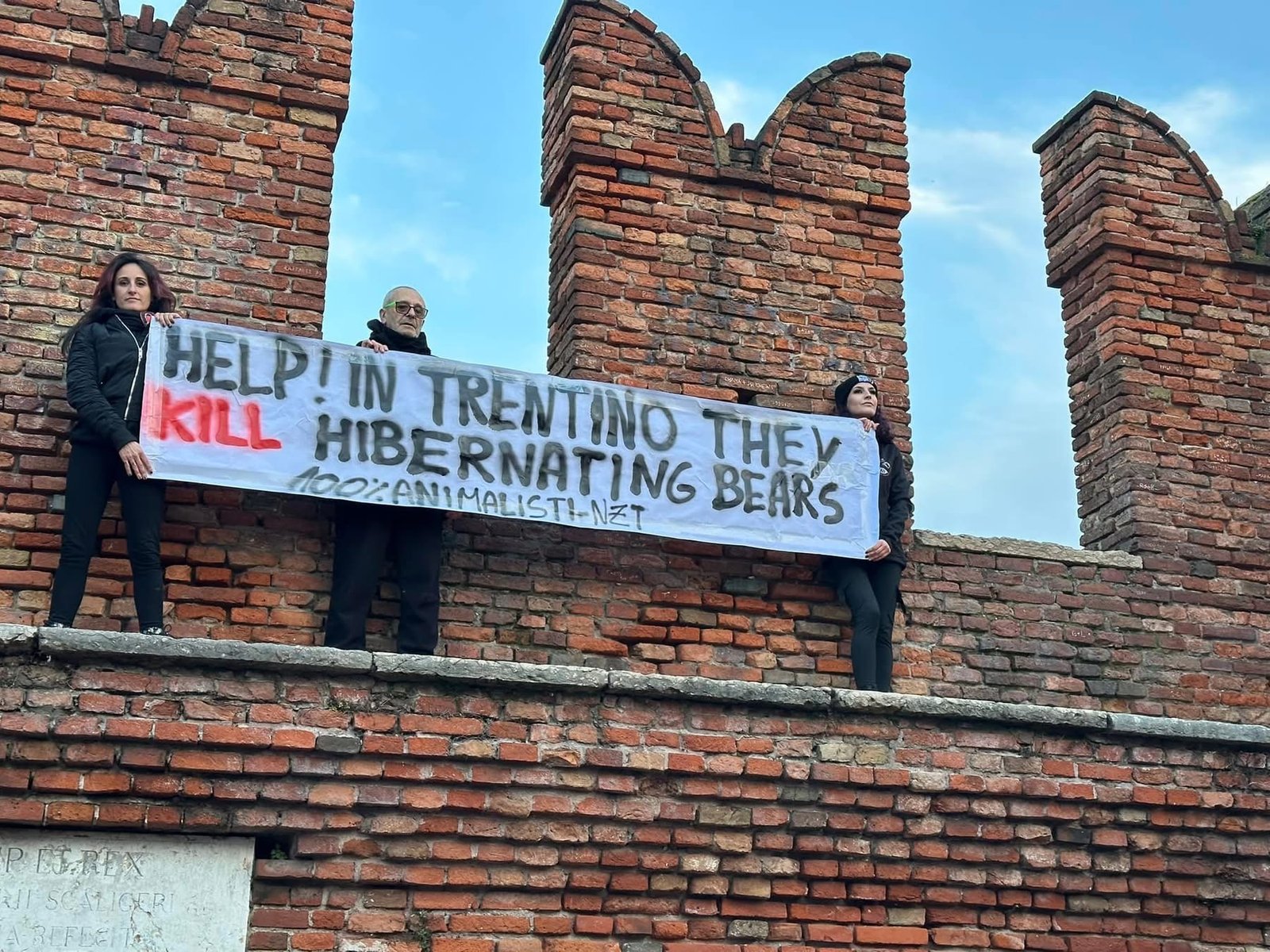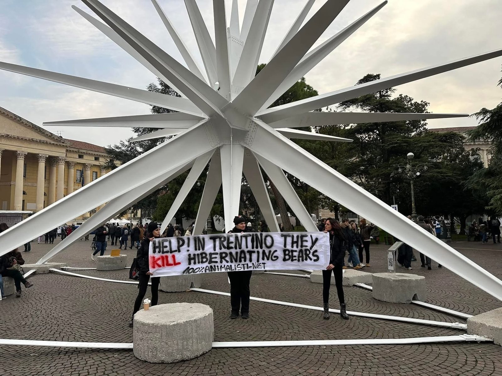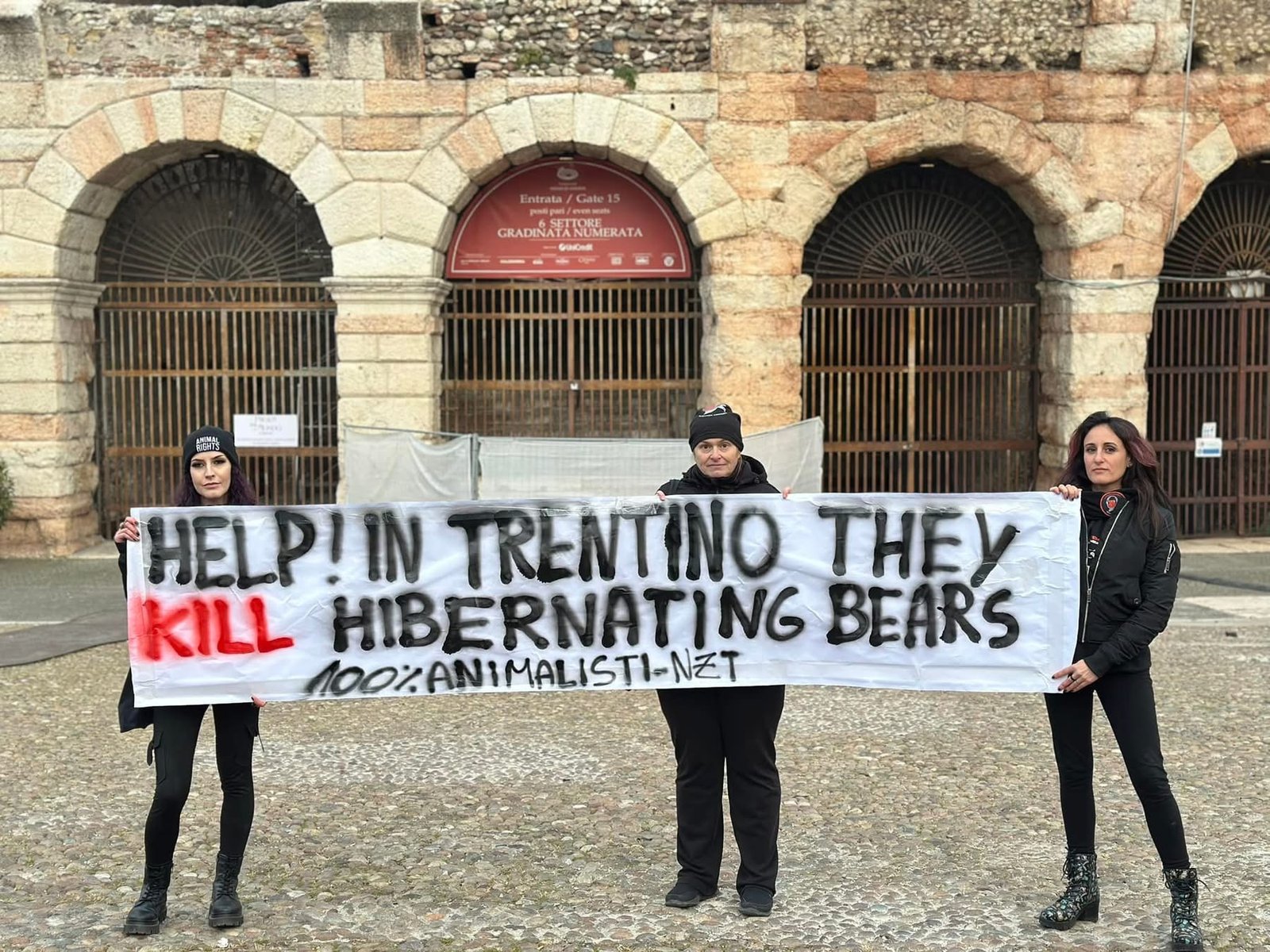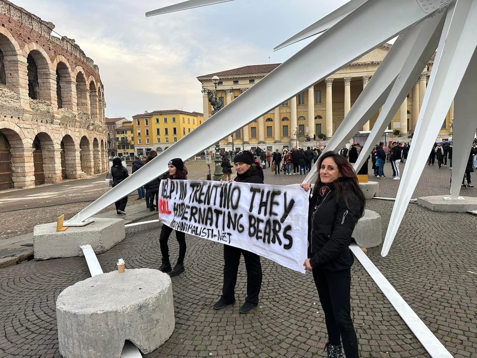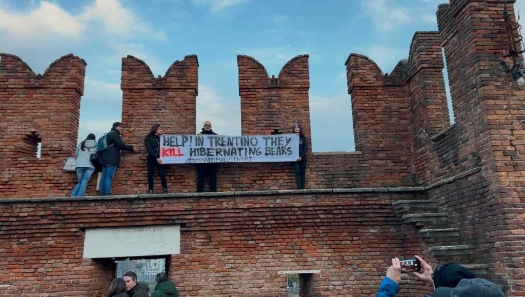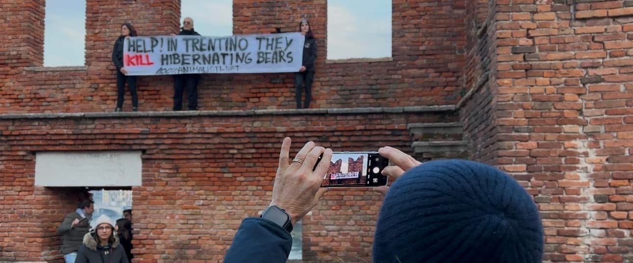 Sabato pomeriggio 7 dicembre, alcuni Militanti del Movimento CENTOPERCENTOANIMALISTI, si sono posizionati davanti alla stella di piazza Bra in fianco all’arena di Verona, ed hanno esposto uno striscione in lingua inglese per attirare l’attenzione dei turisti sulle esecuzioni degli Orsi del Trentino: “help! in Trentino they kill hibernating bears!”. Dopo si sono recati a castel vecchio. Turisti solidali con la protesta, numerose le foto scattate.