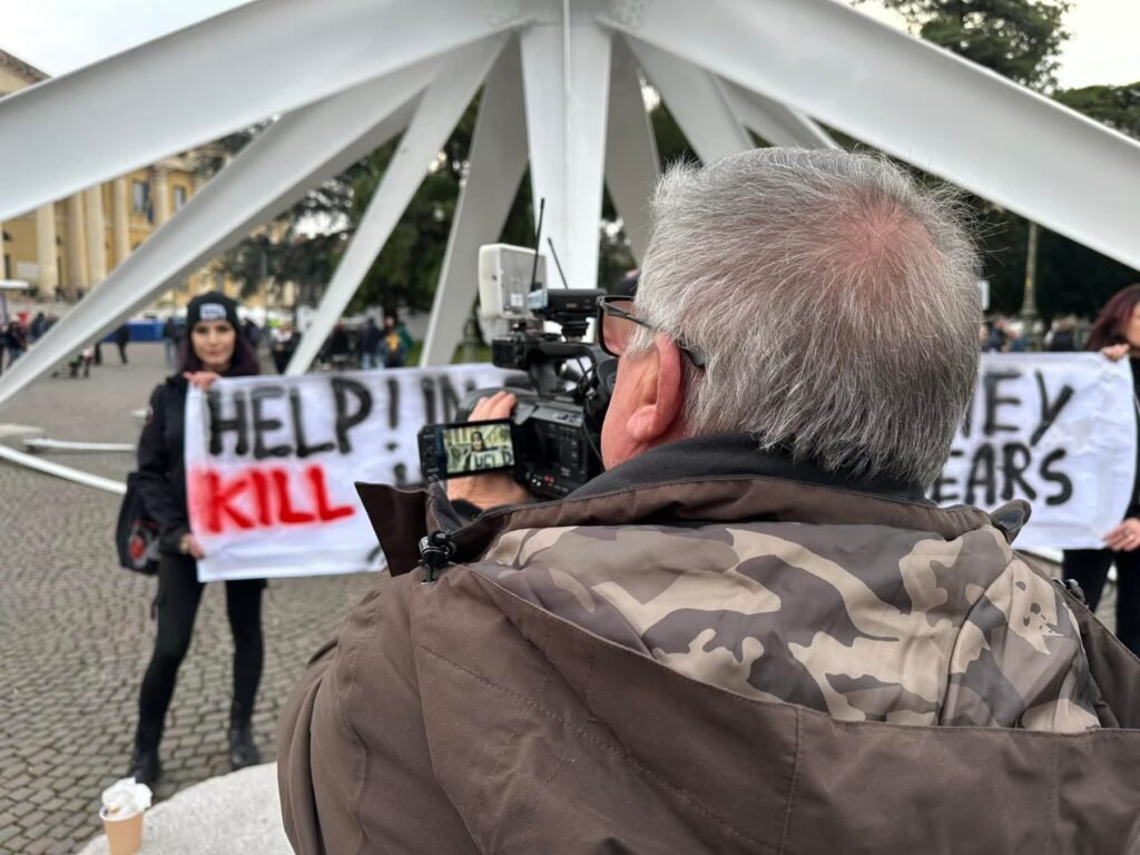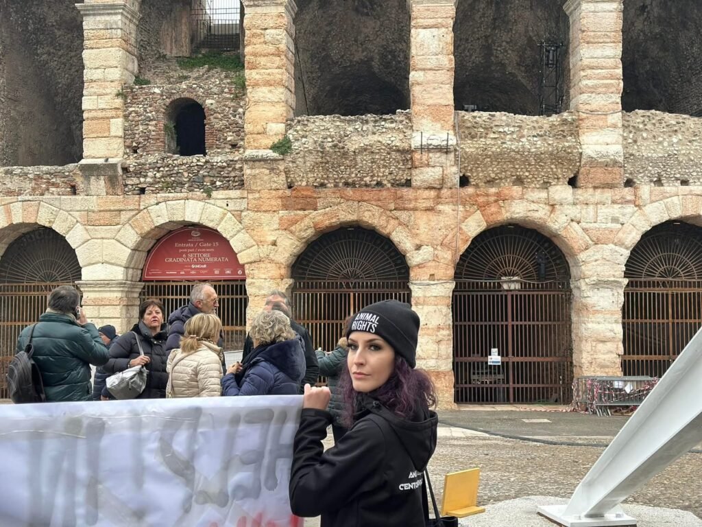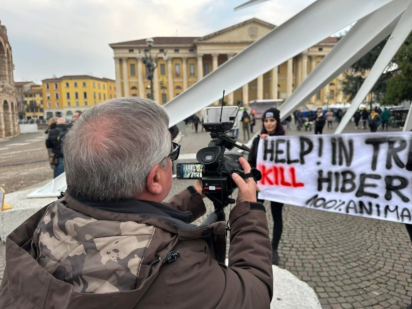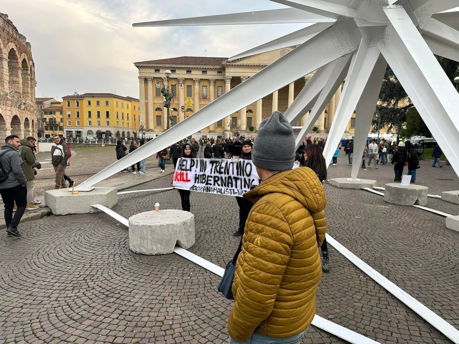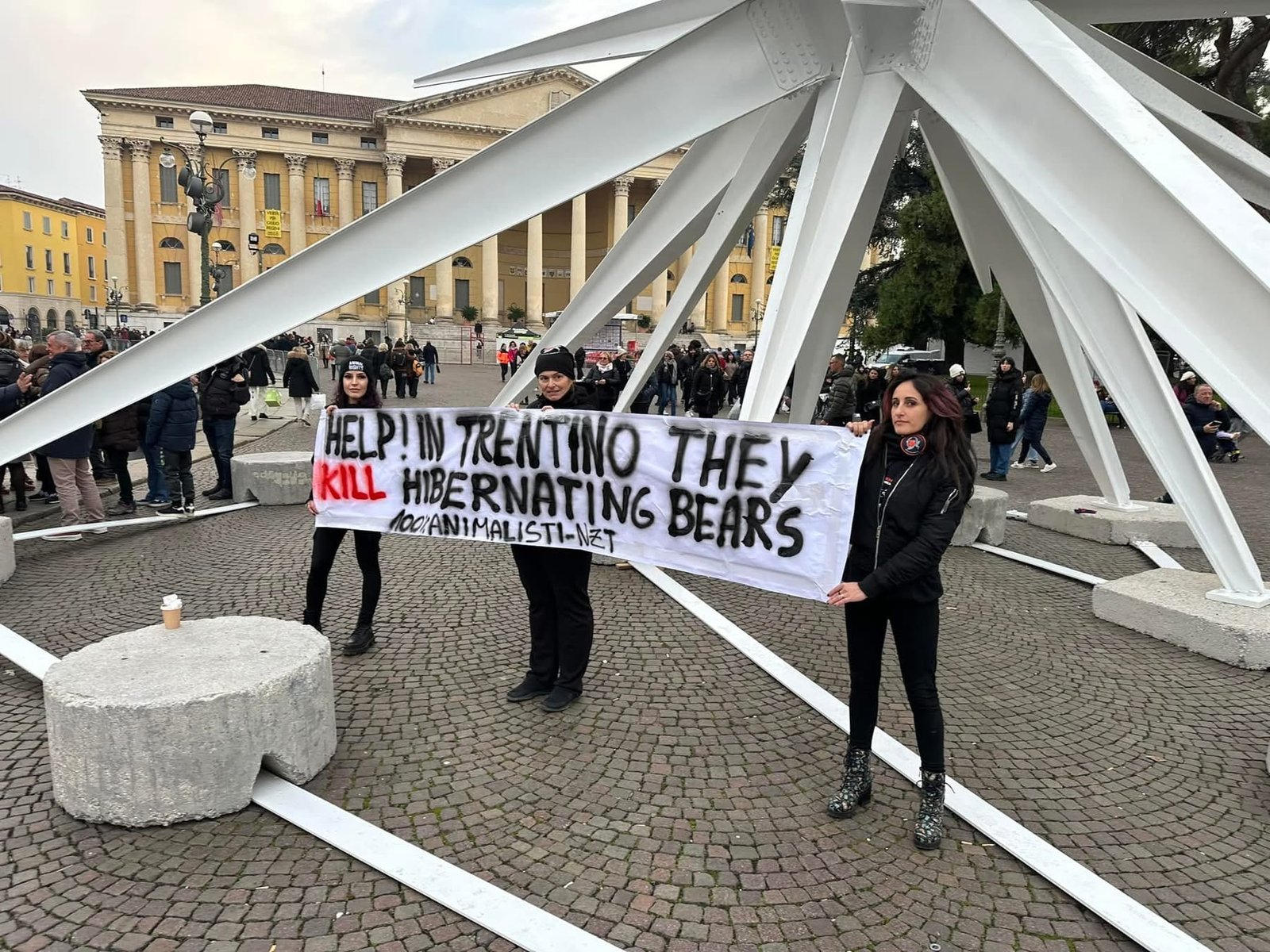 Sabato pomeriggio 7 dicembre, alcuni Militanti del Movimento CENTOPERCENTOANIMALISTI, si sono posizionati davanti alla stella di piazza Bra in fianco all’arena di Verona, ed hanno esposto uno striscione in lingua inglese per attirare l’attenzione dei turisti sulle esecuzioni degli Orsi del Trentino: “help! in Trentino they kill hibernating bears!”. Dopo si sono recati a castel vecchio. Turisti solidali con la protesta, numerose le foto scattate.