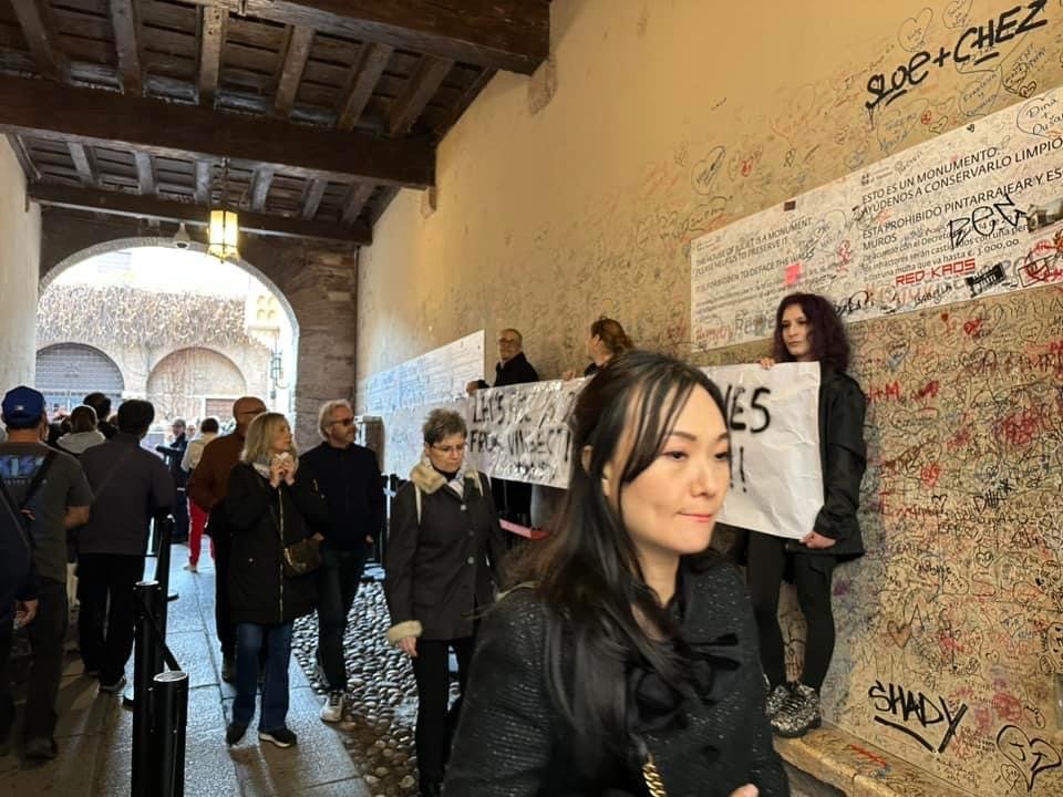 Militanti di CENTOPERCENTOANIMALISTI, sabato mattina 5 ottobre, si sono recati alla casa di Giulietta a Verona, ed hanno esposto uno striscione in lingua Inglese rivolto ai turisti, che hanno solidarizzato con la protesta.