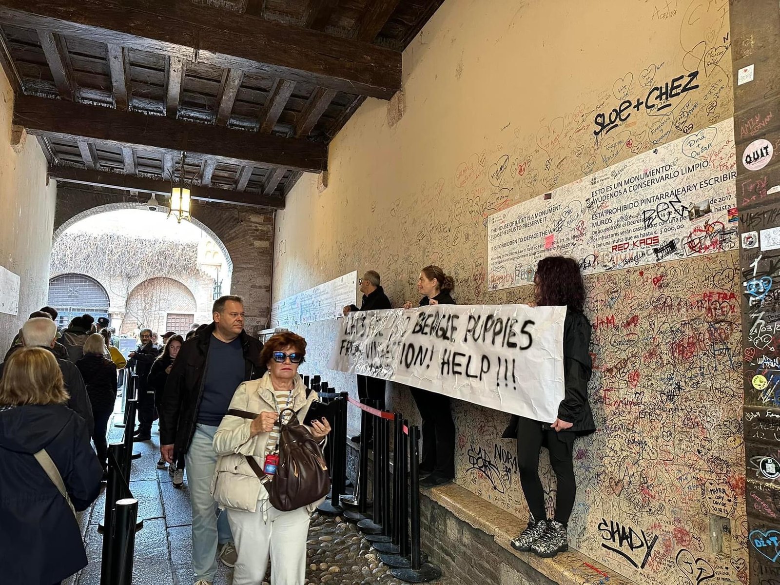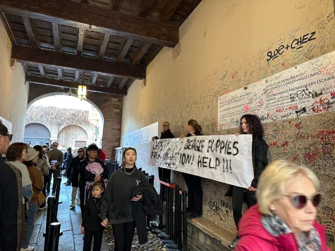 Militanti di CENTOPERCENTOANIMALISTI, sabato mattina 5 ottobre, si sono recati alla casa di Giulietta a Verona, ed hanno esposto uno striscione in lingua Inglese rivolto ai turisti, che hanno solidarizzato con la protesta.