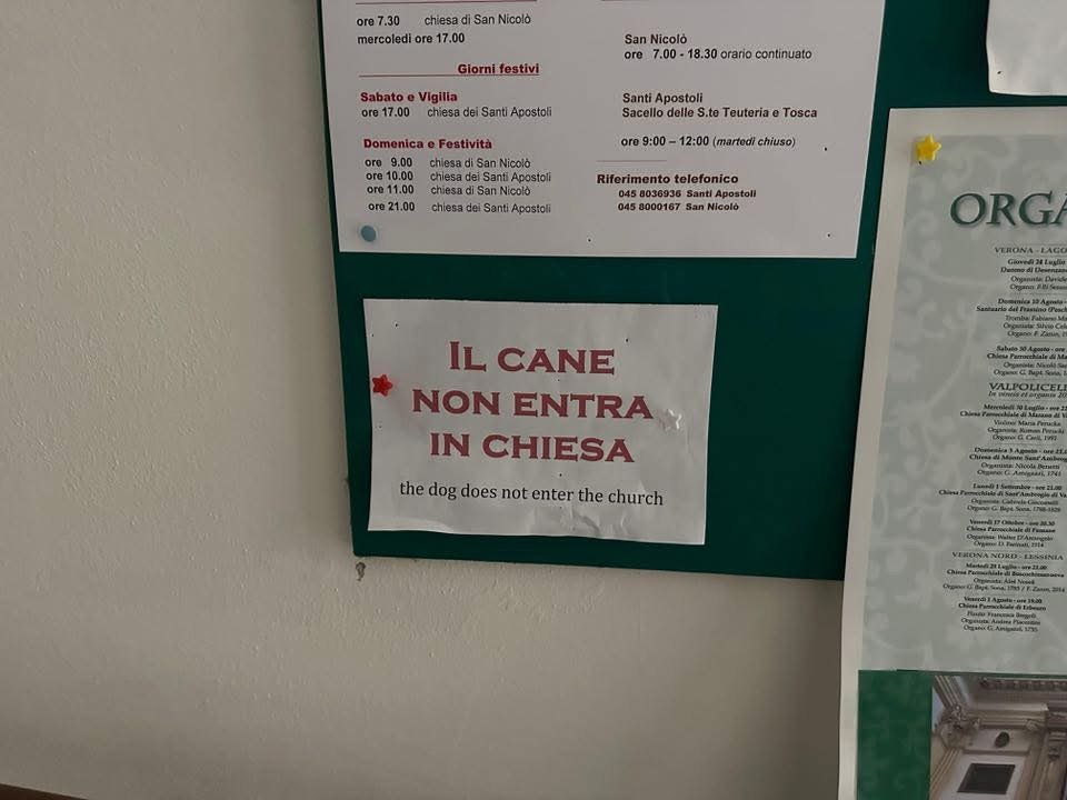 Il luogo da sempre, è meta di turisti, ma una decisione del parroco ha lasciato tutti di sale. Sui portoni e all’interno della chiesa, sono stati affissi cartelli in lingua Italiane e Inglese, dove si vieta l’accesso ai Cani.