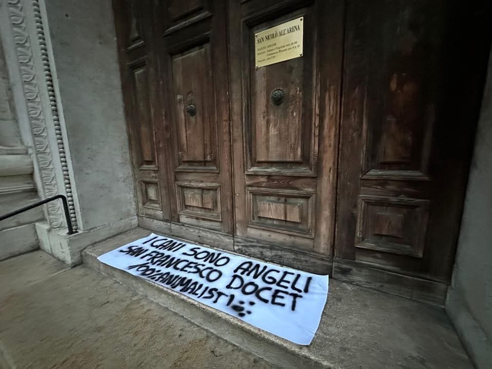 Lo striscione recitava: i Cani sono Angeli, San Francesco docet!