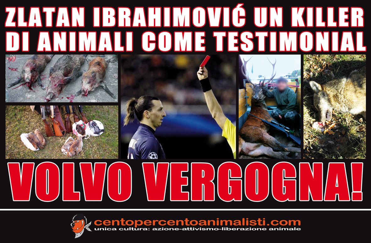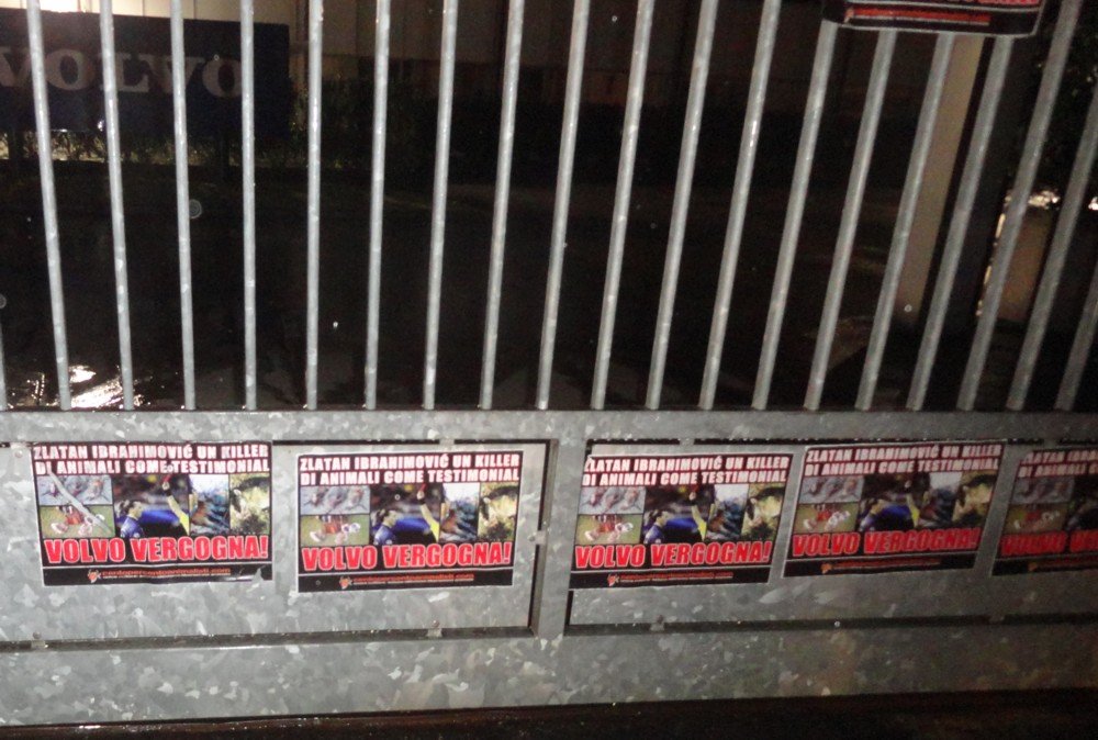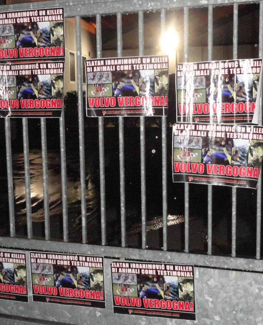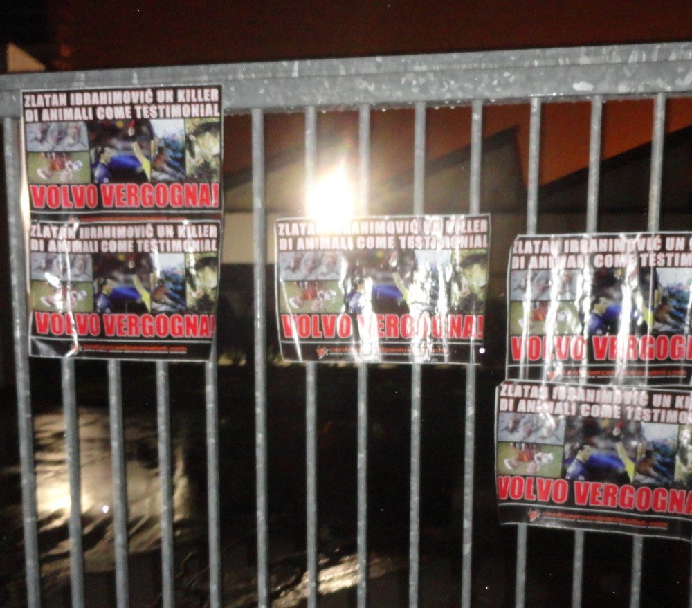 Nella notte tra il 23 e il 24 gennaio, militanti di CENTOPERCENTOANIMALISTI hanno affisso sui cancelli della sede Volvo Italia, in via Enrico Mattei, 66 a Bologna, numerose locandine stampate a tempo di record (la notizia dello spot è di ieri pomeriggio) rivolta sia a Ibrahimovic che all’azienda. Questa azione di protesta non sarà la prima e nemmeno l’ultima contro la Volvo, lo ripetiamo, è intollerabile far passare un cacciatore come una persona rispettabile, soprattutto nel terzo millennio. Vergogna!